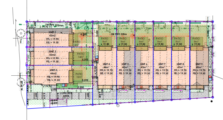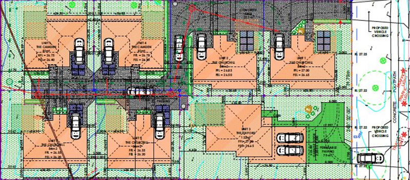 The Ashcroft Planning and Subdivision team worked through how each of these obstacles could be overcome. Discussions were held with a Council Arborist who granted approval for removal of one of the berm trees, freeing up an entrance to the site. A traffic engineer was consulted and agreed the proposed site access entranceway was appropriate and safe in relation to the pedestrian crossing. The neighbour was also consulted and agreed to allow access and works on his property to connect drainage.