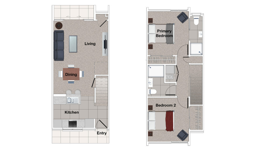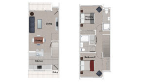 The floorplan shown represents one home of this design. In a duplex or terraced configuration, the neighbouring home may be a mirrored version of this layout.